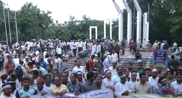 সরকারি সিদ্ধান্তে এমপিওভুক্ত শিক্ষক-কর্মচারীদের বাড়ি ভাতা মূল বেতনের ৫ শতাংশ বা ন্যূনতম ২ হাজার টাকা নির্ধারণের ঘোষণা প্রত্যাখ্যান করে কেন্দ্রীয় শহীদ মিনারে মহাসমাবেশ করছেন শিক্ষকরা।